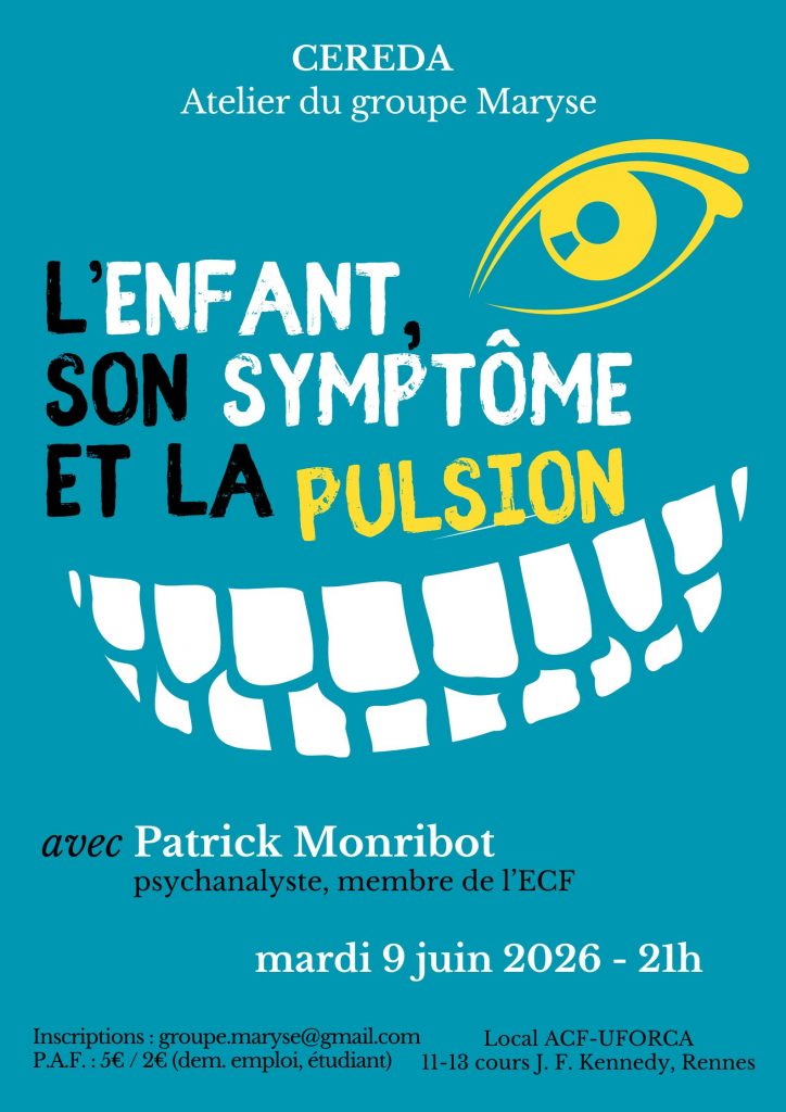 Voici les questions qu’abordera Patrick Monribot dans son intervention : « À quoi sert le symptôme d’un enfant, et quelles en sont les racines pulsionnelles ? Comment faire advenir un symptôme qui concerne l’enfant afin d’engager le sujet fermement dans une analyse ? Quels sont les déterminants pulsionnels qui polluent son existence ? Et qu’en faire dans la cure comme dans la vie ? Ce sont autant de questions auxquelles nous répondrons. »