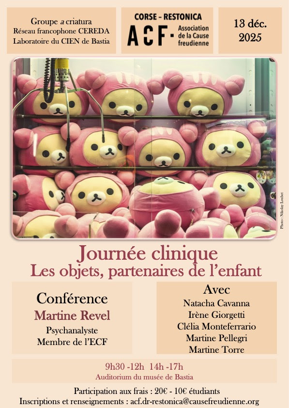 Lors de notre Journée cli­nique inti­tu­lée « Les objets par­te­naires de l’enfant », nous ten­te­rons de mon­trer com­ment le cli­ni­cien orien­té par la psy­cha­na­lyse accueille et accom­pagne le jeune sujet et ses objets, en déga­geant la fonc­tion sin­gu­lière qu’il a pour cha­cun. Objet pré­cieux, objet déchet, objet écran, ou encore objet en trop, il s’agira d’y accor­der une atten­tion par­ti­cu­lière, en se lais­sant ensei­gner par l’usage pré­cis qui en est fait par le sujet qui est accueilli.