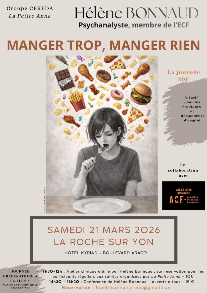 Cette formule indique la façon dont la pulsion écrit le symptôme oral. Pour le nourrisson, l’appel à l’Autre est le premier mode de lien que la mère interprète comme demande que le bébé lui adresse. Le triptyque qu’est l’articulation de la demande, du besoin et du désir, permet de saisir la fonction de l’oralité dans la formation du symptôme. La clinique du rien à l’overdose, sera notre fil.